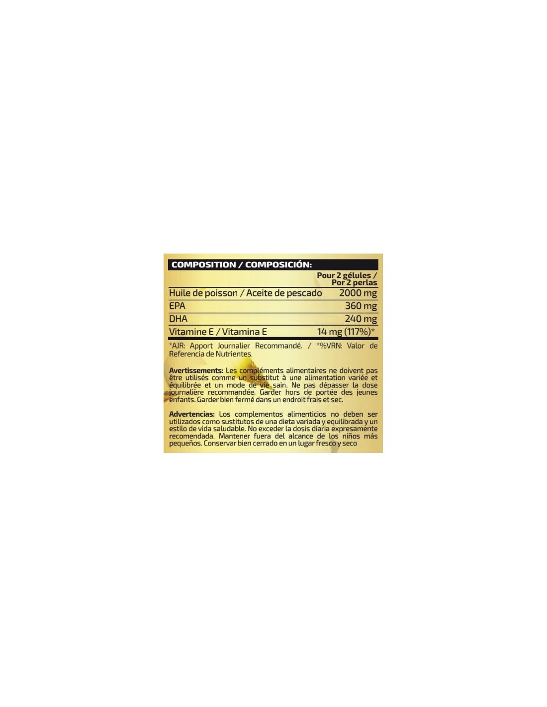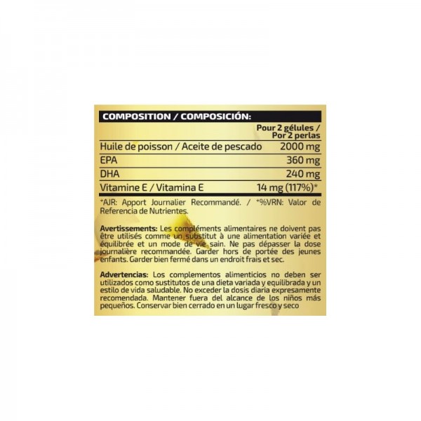Ingredientes: Aceite de pescado, gelatina*, glicerina*, agua* y vitamina E (acetato de DL-alfa-tocoferilo). Puede contener trazas de gluten, huevos, leche y soja.