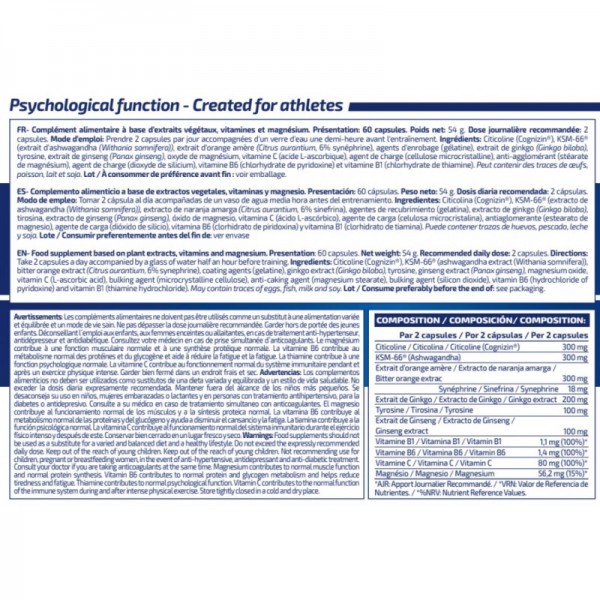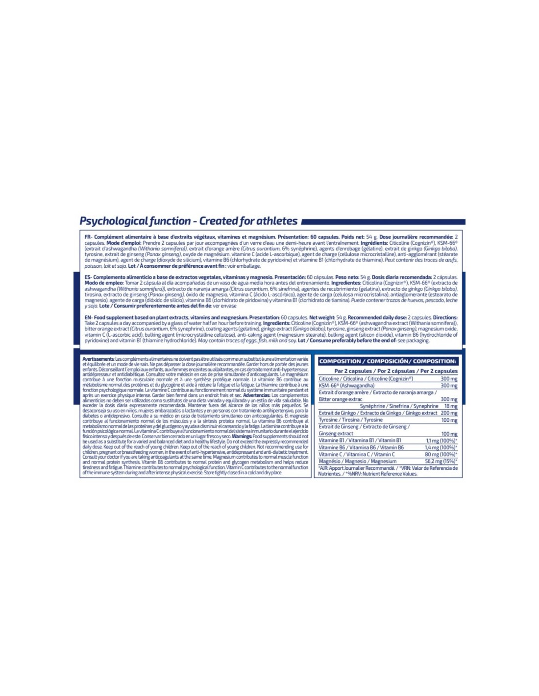Ingredientes:Cognizin®(citicolina), KSM-66® (extracto de ashwagandha (Withania somnifera)), extracto de naranja amarga (Citrus aurantium, 6% sinefrina), agentes de recubrimiento (sulfitos) (gelatina y colorantes (carbonato cálcico y octenil succinato sódico de almidón)), extracto de ginkgo (Ginkgo biloba), tirosina, extracto de ginseng (Panax ginseng), óxido de magnesio, vitamina C (ácido L-ascórbico), agente de carga (celulosa microcristalina), antiaglomerante (estearato de magnesio), agente de carga (dióxido de silicio), vitamina B6 (clorhidrato de piridoxina) y vitamina B1 (clorhidrato de tiamina. Puede contener trazas de gluten (trigo y avena), huevos, pescado, leche y soja