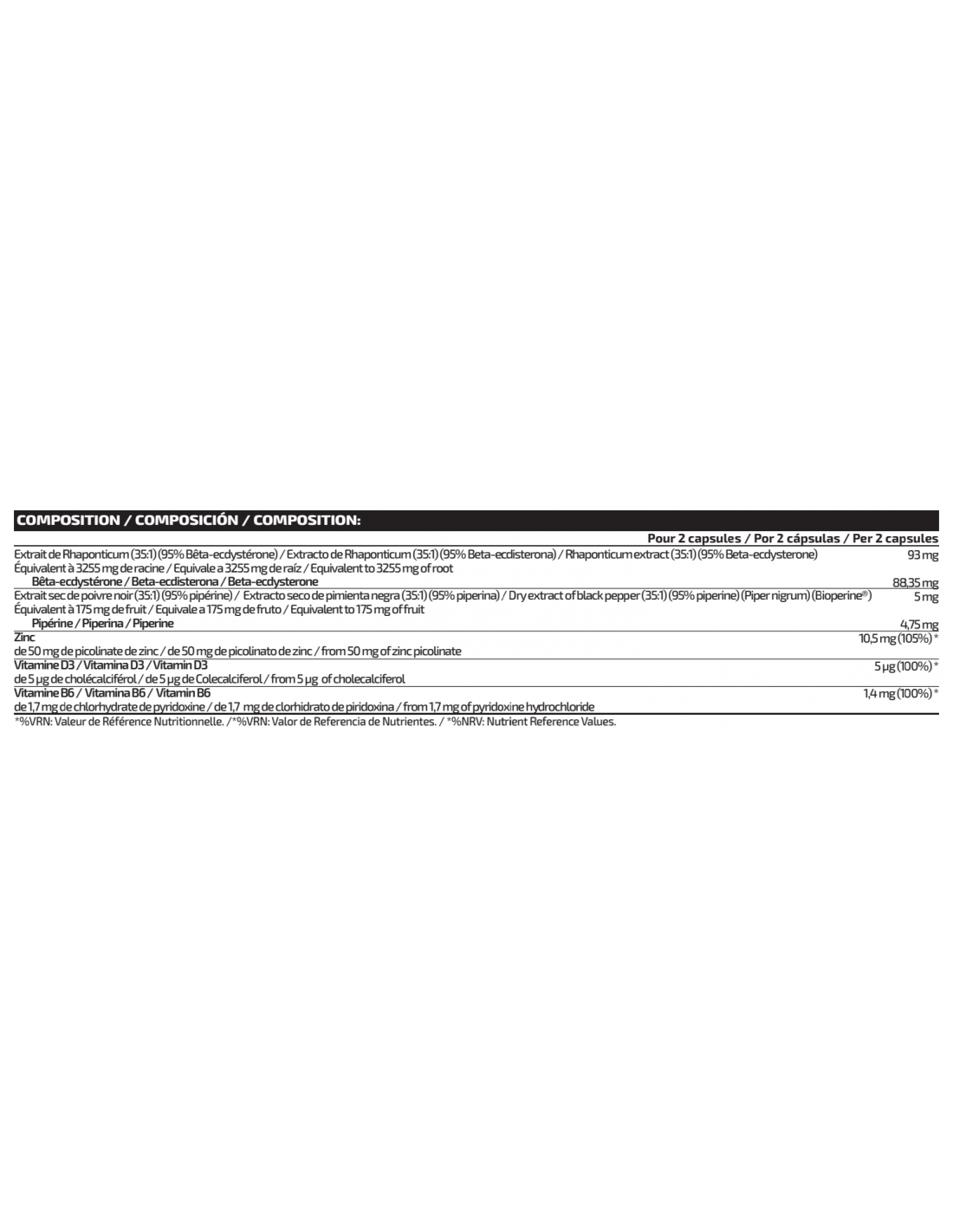 Ingredientes: Maltodextrina, agentes de recubrimiento (gelatina), extracto de rhaponticum carthamoides (Rhaponticum carthamoides (Willdenow) Iljin, raíz, 95% beta-ecdisterona)), picolinato de zinc, Bioperine® (extracto seco de pimienta negra (35:1) (Piper nigrum), fruto, 95% piperina), antiaglomerante (estearato de magnesio), vitamina B6 (clorhidrato de piridoxina) y vitamina D (colecalciferol). Puede contener trazas de gluten (trigo y avena), huevos, leche, pescado y soja.