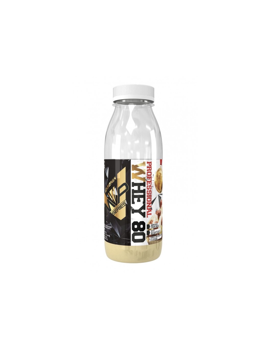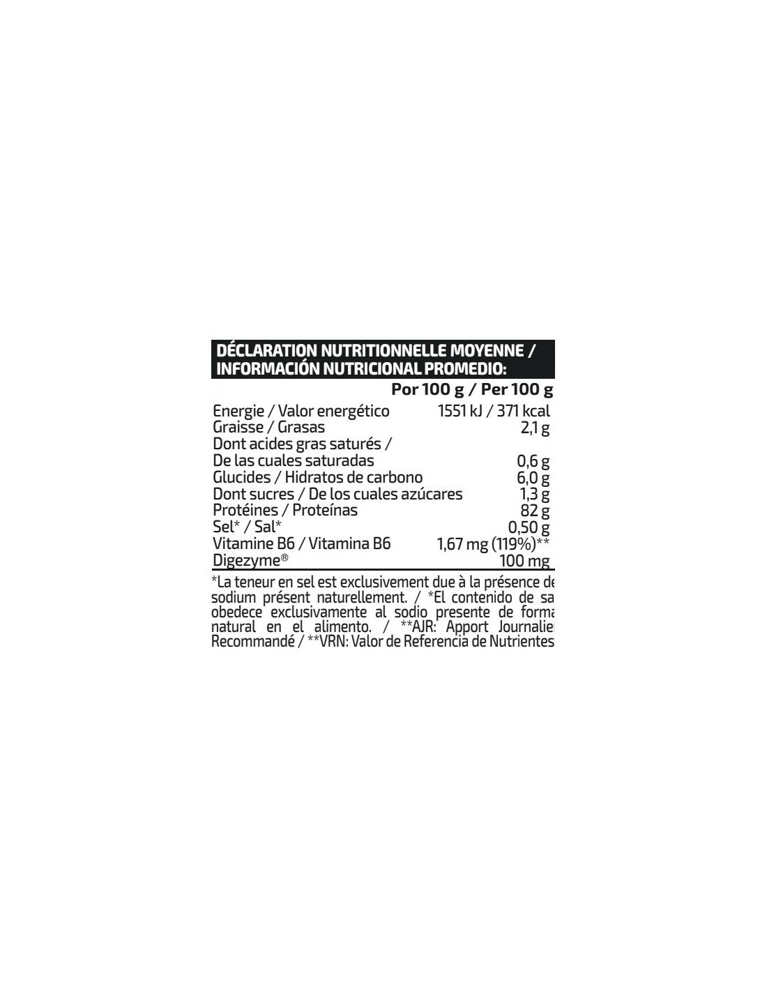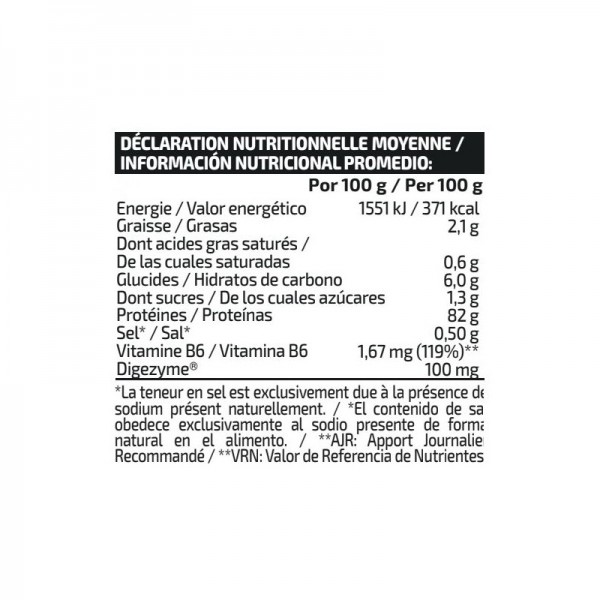 Ingredientes: Concentrado de proteína de suero de leche obtenida por ultrafiltración de flujo cruzado (LACTOMIN®), proteína de leche, aromas (leche), L-leucina, L-isoleucina, L-valina, edulcorantes (sucralosa y acesulfamo K), enzimas digestivas DigeZyme® (complejo multienzimático a base de amilasa, proteasa, lactasa, lipasa y celulasa) y vitamina B6 (clorhidrato de piridoxina). Puede contener trazas de gluten (avena), huevos, soja y pescado. No recomendado para niños ni mujeres embarazadas. Conservar bien cerrado en un lugar fresco y seco.