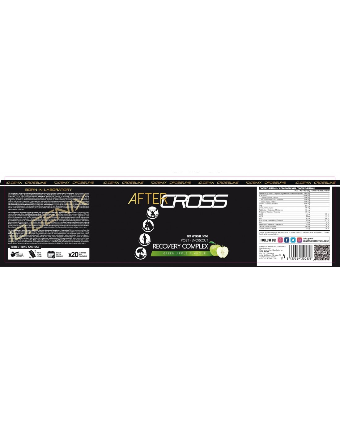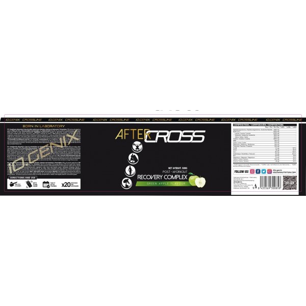 After Cross de IO.GENIX es una bebida post-entrenamiento que contiene un complejo de Aminoácidos Esenciales, componentes proteicos necesarios para que el organismo funcione correctamente, los cuales deben ser tomados necesariamente con la dieta diaria pues el cuerpo no los sintetiza por sí mismo, cruciales para el mantenimiento del cuerpo y de la vida. También contiene Aminoácidos Ramificados Básicos y Esenciales cuya principal tarea en el cuerpo es formar proteínas en el interior del organismo, esencial para formar y mantener los tejidos orgánicos de forma satisfactoria, usados usualmente para la recuperación muscular. De igual manera contiene Creatina la cual mejora sustancialmente el rendimiento y la potencia durante las prácticas deportivas de alto impacto, fomenta el aumento de una masa muscular libre de grasa, ayuda a mejorar los niveles de energía, fuerza, recuperación y retrasa la aparición de la fatiga. Otro elemento importante en el After son los Carbohidratos Complejos que ayudan a regular el metabolismo de las proteínas y grasas, así como constituir una fuente importante de energía para todas las funciones del cuerpo. Además, esta bebida está potenciado con vitaminas y minerales que ayudan a procesos fundamentales del cuerpo como estabilizar los niveles de azúcar en sangre o lograr una función psicológica normal.